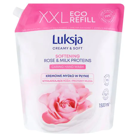 Opis produktu: Luksja Creamy & Soft Kremowe mydło w płynie wygładzające róża i proteiny mleka 1,5 l