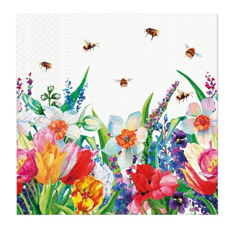 Serwetki zdobią barwne kwiaty, zielone liście i małe pszczółki unoszące się nad wiosenną łąką. Dominujące kolory to jasna zieleń trawy, żółć kwiatów i pszczół oraz delikatne pastelowe odcienie kwiatów. Motyw jest subtelny, ale dekoracyjny, dzięki czemu serwetki pasują do różnych aranżacji stołu – zarówno klasycznych, jak i nowoczesnych. Jasne tło podkreśla wyrazistość wzoru.