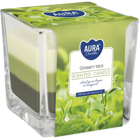 Aktualnie przeglądasz opis towaru „Bispol świeca zapachowa w szkle trójkolorowa SNK80-83 Zielona Herbata.”